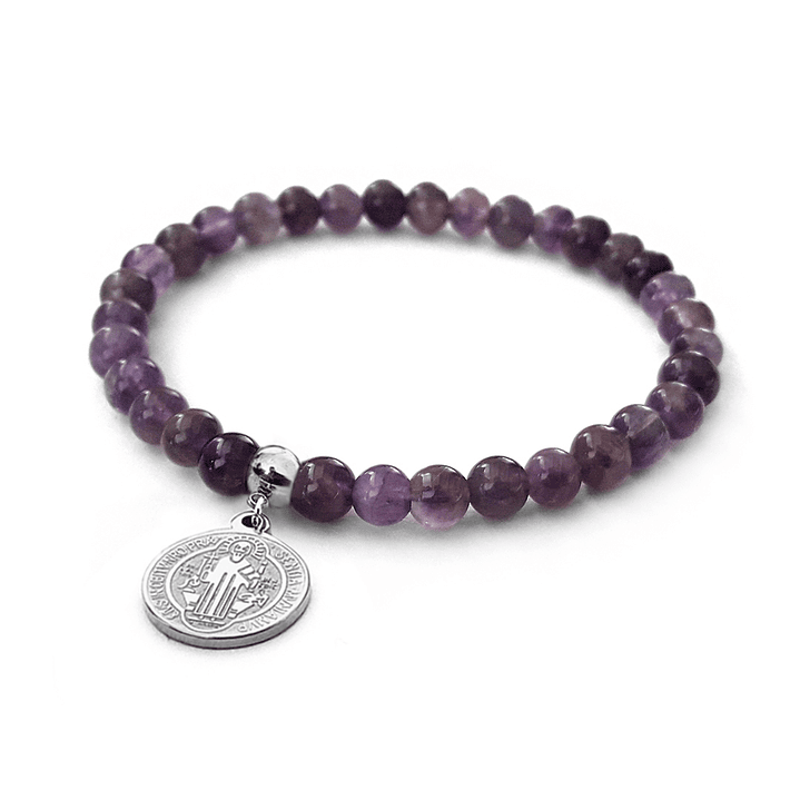 Adquiere tu Pulsera de Amatista con Medalla de San Benito de Abad y lleva un símbolo de protección y serenidad dondequiera que vayas.